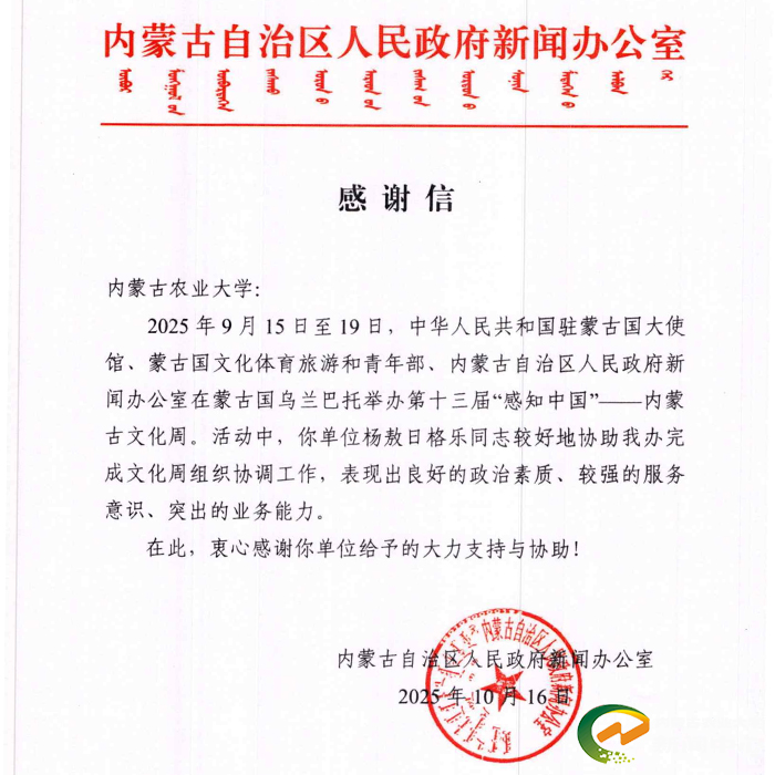期间,我院杨敖日格乐老师在文化周活动中圆满完成相关工作任务。活动结束后,我校收到自治区政府新闻办感谢信,信中高度肯定了杨敖日格勒的组织协调工作,称其充分展现出农大教职工专业务实、担当有为的良好形象,并对学校在促进中蒙文化交流中作出贡献致以诚挚谢意。