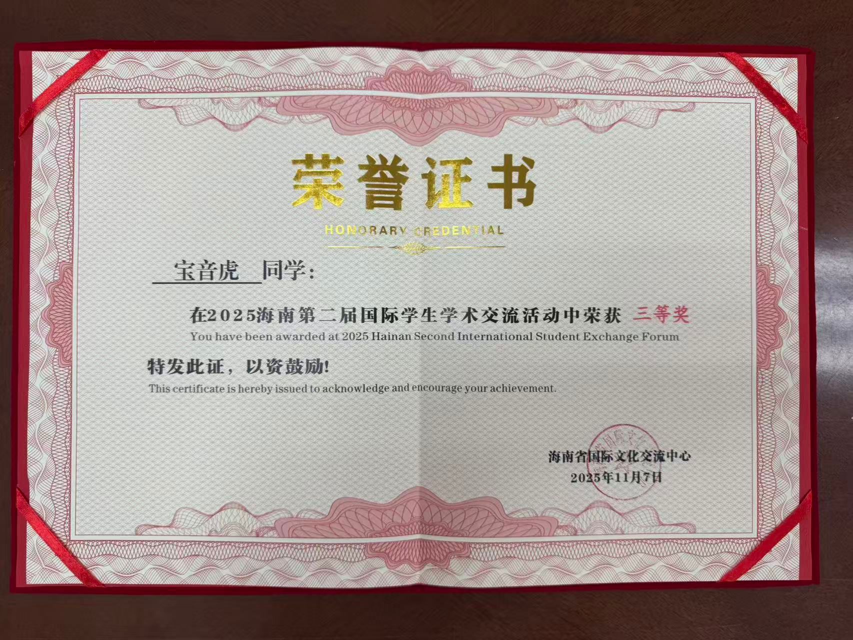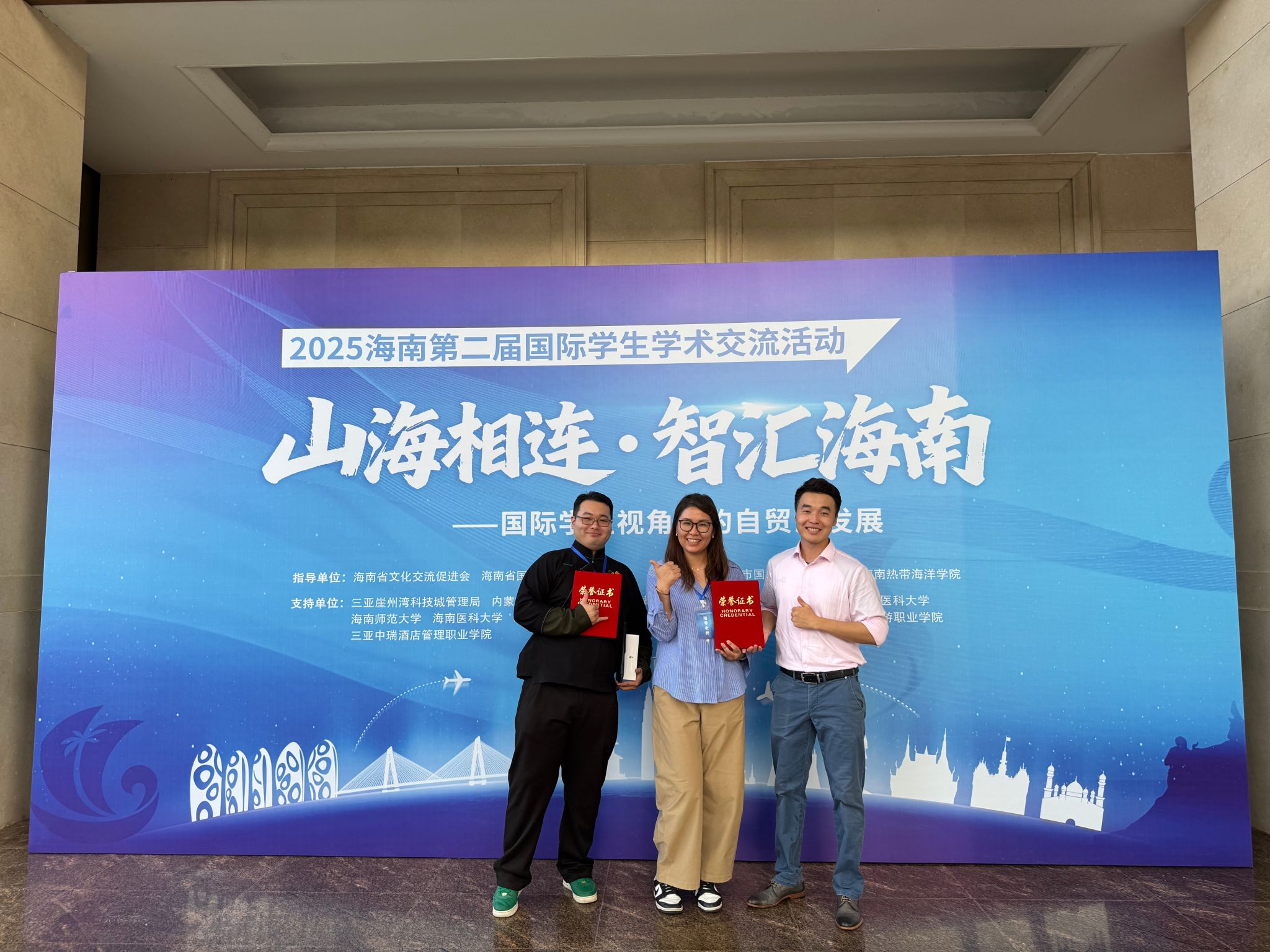 2025年11月7日,以“山海相连・智汇海南:国际学生视角下的自贸港发展”为主题的2025海南第二届国际学生学术交流活动在三亚市举行。本次活动由海南热带海洋学院与三亚市国际文化交流中心联合主办,汇聚了全球14个国家的29名国际学生、12所高校师生及各界嘉宾代表,共话海南自由贸易港建设新机遇。艾敏老师带领我院两名蒙古国留学生BUYANKHUU、TELMUUN受邀参赛,凭借现场的精彩表现BUYANKHUU荣获三等奖,艾敏老师获评优秀指导奖。