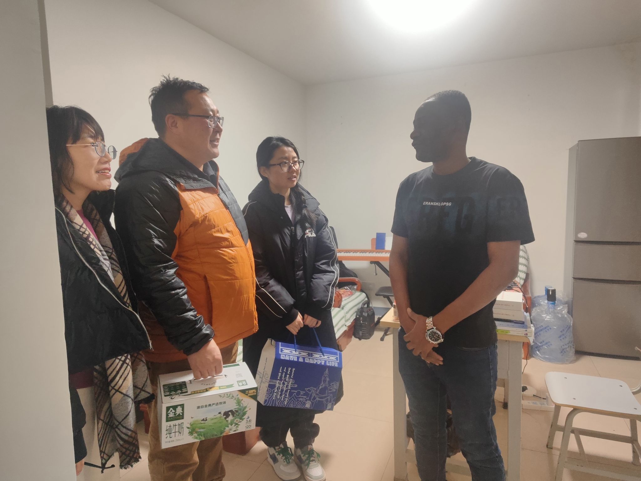 为进一步关注留学生心理健康问题,加强我校留学生管理 ,营造良好的留学生活氛围,切实保障寒假期间校园安全稳定。2月12日上午,我院副院长额日很宝力嘎、教师白婧、孙皓前往南校区留学生宿舍楼对留校学生及值班人员进行走访慰问。